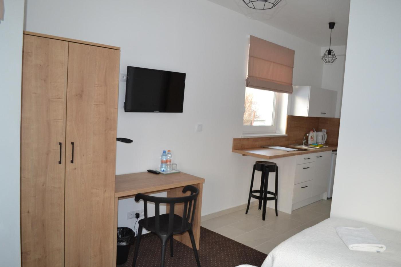 Pokój dwuosobowy – aneks. The double room features a tea and coffee maker, a dining area, as well as a private bathroom boasting a shower and a hairdryer. The fully equipped kitchenette has a stovetop, a refrigerator, kitchenware and a microwave. The double room features a flat-screen TV, a wardrobe, a carpeted floor, as well as heating. Pokój Dwuosobowy - 2 osobowy. Powierzchnia pokoju ok.: 23 mkw. ;